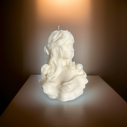 Explore our captivating goddess candle, embodying elegance & grace. Ideal for chic, moody aesthetics. Elevate your home décor with its sophisticated design, emitting a calming ambiance. Dimensions: W 4.5" x H 5.5". Handcrafted and hand poured in Anchorage, AK.